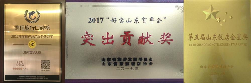 2017“好客山東賀年會”突出貢獻(xiàn)獎(山東省旅游發(fā)展委員會、山東省旅游飯店協(xié)會, 2017.1)