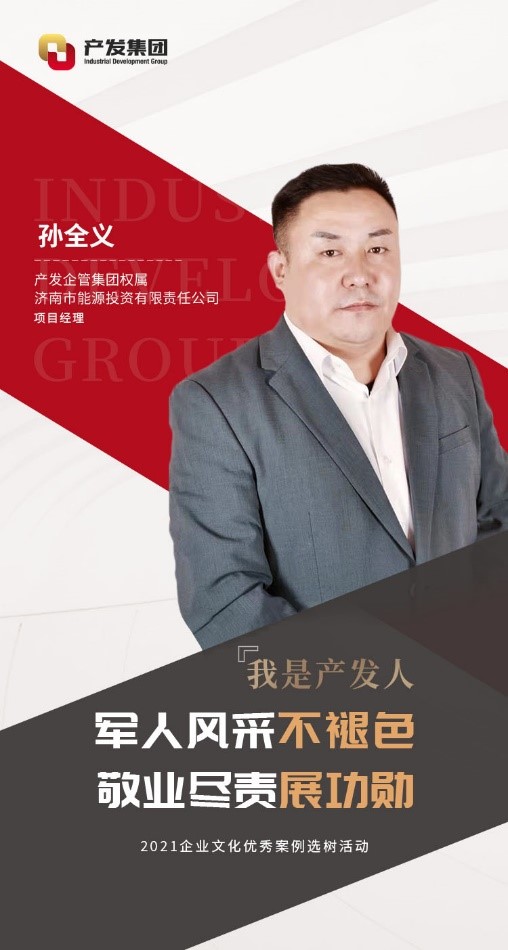 孫全義,現(xiàn)任產(chǎn)發(fā)企管集團(tuán)權(quán)屬濟(jì)南市能源投資有限責(zé)任公司(以下簡(jiǎn)稱“能投公司”)項(xiàng)目經(jīng)理。2001年參軍,在部隊(duì)期間刻苦訓(xùn)練,聽黨指揮,服從命令。2003年他從部隊(duì)光榮退役,隨后加入能投公司。期間曾借調(diào)至濟(jì)南市發(fā)改委幫助工作,現(xiàn)負(fù)責(zé)能投公司的資產(chǎn)管理工作。