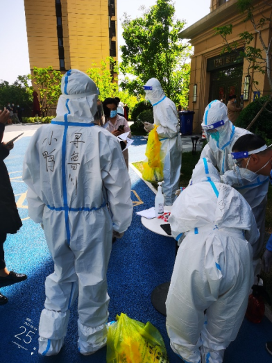 由于一直在高溫下“全副武裝”,志愿者的防護(hù)服早已被汗水浸濕,手掌被泡得發(fā)白,臉上也被口罩勒出了痕跡,更有志愿者出現(xiàn)了頭暈、流鼻血等中暑癥狀。盡管如此,他們也是稍加休整,便再次沖鋒向前。休息時(shí)間,志愿者們席地而坐,匆匆吃完奔赴崗位,因忙碌而錯(cuò)過(guò)飯點(diǎn)更是常事,然而他們卻從未有過(guò)怨言;腰肌勞損、椎間盤(pán)不好的團(tuán)隊(duì)干部即使腰疼的直不起來(lái),也依舊抵擋不住他助力抗疫的熱情與行動(dòng)?!▲喼驹刚邔敶ㄔ趨f(xié)助核酸檢測(cè)時(shí),有一個(gè)小男孩很不配合,由于當(dāng)天的核酸檢測(cè)并沒(méi)有貼紙,男孩媽媽便偷偷準(zhǔn)備了小貼畫(huà),拜托尋魯川給小朋友貼上。尋魯川很感動(dòng),并且樂(lè)意幫忙,尋魯川說(shuō):“他兩只大眼睛直勾勾的盯著貼紙看,特別萌,心都被萌化了,真是開(kāi)心了一整天,所有的疲憊都一掃而空。” …… 在抗“疫”前線,小鴨人和社區(qū)居民們互相理解,互相配合,如此令人感動(dòng)又暖心的事跡不勝枚舉。