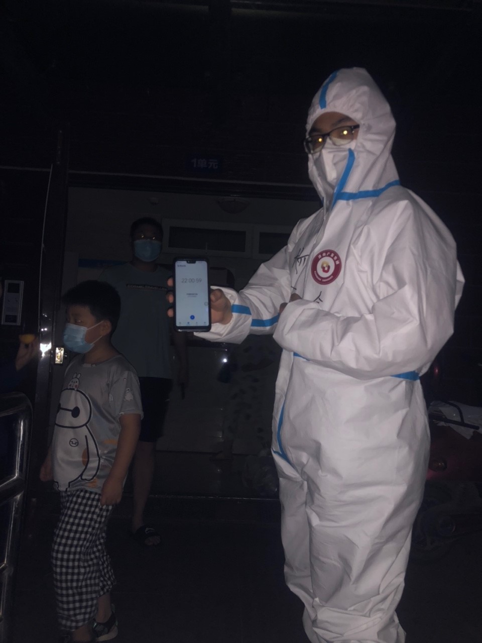 集團(tuán)支援天橋區(qū)濱河雅居的下沉人員由翟思成帶隊(duì),帶領(lǐng)郭正亮、杜瑞帥、趙士民、楊世興、馮鵬飛等5名志愿者,自4月27日進(jìn)駐濱河雅居社區(qū)以來(lái),他們聽(tīng)從社區(qū)安排,進(jìn)行核酸檢測(cè)維持秩序,人員摸排、統(tǒng)計(jì)數(shù)據(jù)等工作?!懊刻煜掳喽嫉猛砩?0點(diǎn)半了”, 翟思成說(shuō),為保證社區(qū)居民核酸檢測(cè)不漏一人,雖然大家的居住地距離濱河雅居都很遠(yuǎn),但還是克服重重困難按時(shí)到崗,盡職盡責(zé)地完成社區(qū)工作。特別是自4月28日以來(lái),濱河雅居樓棟出現(xiàn)密接和次密接,需要24小時(shí)管控,金鐘集團(tuán)的志愿者白天維持核酸檢測(cè)秩序、給管控居民送菜送食品,晚上還要值夜班、進(jìn)行住戶摸查,條件艱苦、工作勞累,但是志愿者們沒(méi)有怨言、只有擔(dān)當(dāng),他們用實(shí)際行動(dòng)踐行國(guó)企責(zé)任,使命擔(dān)當(dāng)。