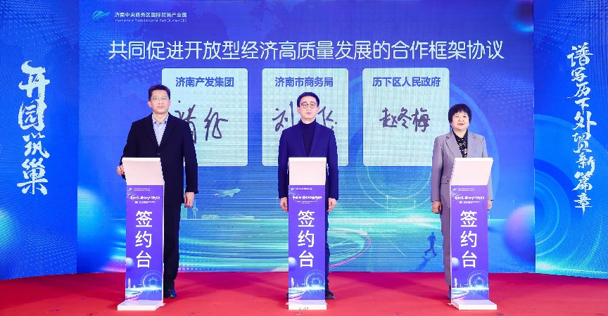 在入駐簽約環(huán)節(jié),濟(jì)南國商園區(qū)運營管理有限公司總經(jīng)理陳蕾與華潤置地中心項目負(fù)責(zé)人李靜宜簽訂了委托運營協(xié)議;劉燕飛、趙冬梅、褚征分別代表濟(jì)南市商務(wù)局、濟(jì)南市歷下區(qū)人民政府、濟(jì)南產(chǎn)發(fā)集團(tuán)共同簽署《共同促進(jìn)開放型經(jīng)濟(jì)高質(zhì)量發(fā)展合作框架協(xié)議書》;王紅、楊傳軍、趙治文、楊福濤、王海清、黃蓓、邵丹丹共同按下啟動開園按鈕,宣告濟(jì)南中央商務(wù)區(qū)國際貿(mào)易產(chǎn)業(yè)園正式開園。